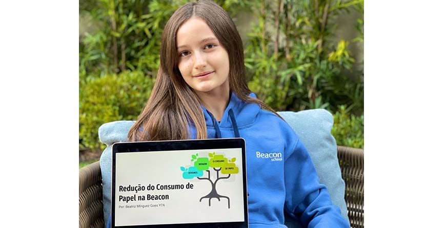 Beatriz, aluna do 7º ano (Y7), atenta à questão da sustentabilidade, resolveu voluntariamente mensurar o uso do papel pelos alunos da escola. Ao coletar diversos dados e realizar significativa análise, elaborou uma apresentação contendo informações sobre consumo, razões para redução de uso e propostas alternativas aos cadernos físicos.