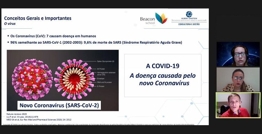 Liderado pela equipe de Consultoria Einstein, a Beacon convidou os pais para um webinar de apresentação dos protocolos de segurança e de saúde criados especialmente para nossas unidades. O encontro permitiu às famílias que conhecessem mais a fundo o trabalho desenvolvido ao longo dos últimos meses e os critérios estabelecidos para a retomada segura das aulas presenciais.