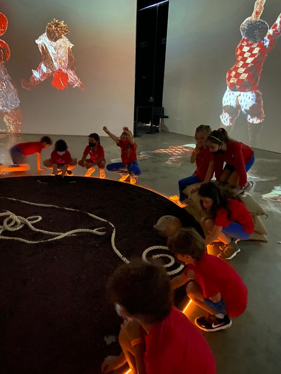 When they arrived at MIS, the groups were received by monitors, who explained that the exhibition was divided into three different areas. In the first room, there were several brushes hanging from the ceiling and, as the light projections reflected on the children’s bodies, they changed the color of each one’s skin.